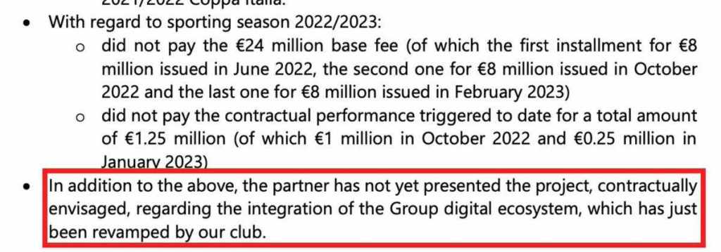 Inter i Roma wiosną tego roku zaczęły coraz to bardziej usuwać Digitalbits ze swoich płaszczyzn reklamowych. Giallorossi pod koniec kwietnia otrzymały od władz Serie A zgodę na grę w domowym meczu z Milanem, rozgrywanym 29.04.2023 roku, w nowej odsłonie trykotów. Znane i legendarne SPQR zdobiło przód ich koszulek. Ten skrót oznaczający Senatus Populusque Romanus, łacińską formułę oznaczającą „senat i lud rzymski”, użyli już w trakcie derbów Rzymu w 2017 roku. Inter z wyjątkiem finału Ligi Mistrzów, gdzie na ich koszulkach widniał Paramount+, grał kilka meczów bez jakiegokolwiek napisu na froncie koszulek. Grał za to dobrymi wynikami bo wszystkie pięć pierwszych meczów bez sponsora wygrali, zdobywając 17 goli i tracąc ledwo trzy. Ich łupem padły m.in. Derby della Madonnina oraz mecz z Romą. Zaiste, takich rzeczy to jeszcze nie było. I tak niesamowicie długo oba włoskie klubu reklamowały Digitalbits, które ową reklamę miało na krzywy ryj. A ich umowy zakładały też bonusy za osiągnięcia Romy i Interu, zarazem też możliwe, iż prawnicy radzili Włochom zwlekać z usuwaniem logo, uwzględniając różne kruczki prawne obowiązujących kontraktów.