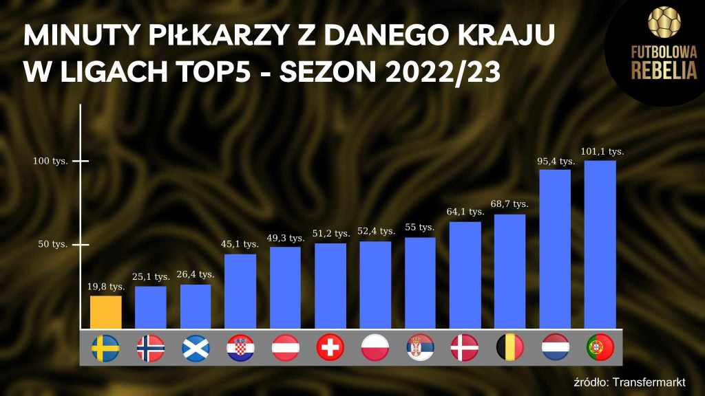 W sezonie 2022/23 szwedzcy piłkarze rozegrali łącznie niecałe 20 tysięcy minut w ligach TOP5. Dla porównania, zarówno Austriacy, Szwajcarzy, Polacy i Serbowie przebijają ten wynik ponad dwukrotnie. Duńscy piłkarze rozegrali łącznie 64 tysiące minut, norwescy – 25 tysięcy, czyniąc Szwecję pod tym względem najgorszą w całej Skandynawii. Ta sama Norwegia na rozwój piłkarskich akademii przeznacza ok. 6 razy więcej pieniędzy od Szwecji.