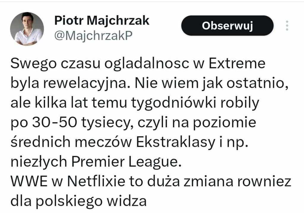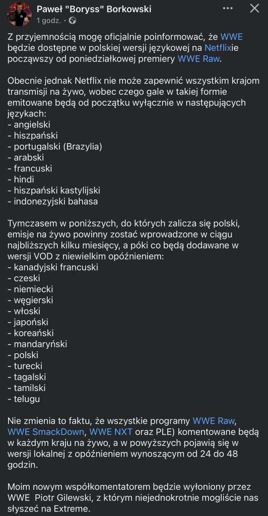 Dziś Extreme zostaje wygryzione z rynku przez goliata branży medialnej w postaci Netflixa. Przetrwa jednak komentarz Pawła Borkowskiego, który ogłosił nie dawno na swoich socjalach, że Polska znalazła się w gronie krajów, które zostaną wyróżnione możliwością obejrzenia produktów World Wrestling Entertainment na czerwonej platformie wraz z polskim komentarzem. Popularnemu Boryssowi towarzyszyć będzie natomiast Piotr Gilewski, który zastąpi za mikrofonem srebrnego medalistę olimpijskiego z Igrzysk w Moskwie – profesora zapasów Andrzeja Suprona.