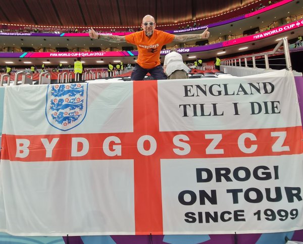 Podczas meczów reprezentacji Anglii na mundialu w Katarze uwagę polskich kibiców przykuła flaga tego kraju z napisem „Bydgoszcz”. Jej właścicielem jest Tomasz Drogowski ps.Drogi. Prawdopodobnie jedyny Polak, jeżdżący na wszystkie mecze drużyny „Trzech Lwów”. Kiedy zaczął kibicować Anglikom? Jak został przyjęty przez Wyspiarzy? Jak doszło do powstania flagi „Bydgoszcz”? Na te oraz inne pytania odpowiedzi znajdziecie poniżej. Zapraszam.