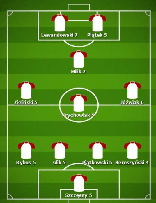 Perfekcyjnie wywiązał się w roli zastępcy Lewandowskiego. Strzelenie bramki było formalnością, ale oprócz tego pokazał umiejętności, które cechują naprawdę dobrego napastnika. Możemy się zastanawiać, czy jego strzał w poprzeczkę był dziełem przypadku, ale zgranie z obrońcą na plecach z 58’, które napędziło naszą ofensywę, już na pewno nie. A to wymagało dużej piłkarskiej klasy. 7/10
